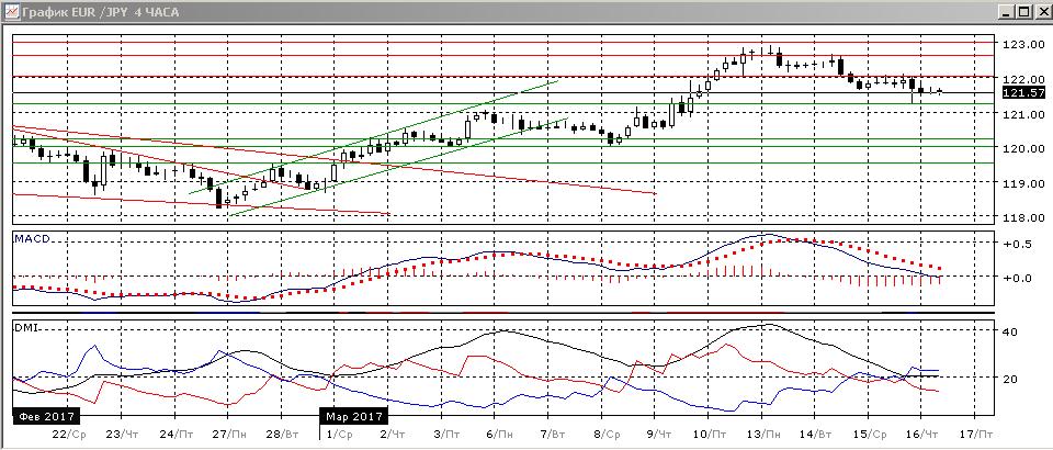 На дневном графике откат от 123,00 приостановился выше уровня 121,25, это уровень сопротивления середины февраля и поддержки в январе. Пока откат остаётся в пределах коррекции к росту. Последовательность роста относительных максимумов и минимумов пары не нарушена. По индикаторам направленного движения тенденция роста сохраняется: гистограмма MACD остаётся в положительной зоне, линия MACD имеет положительный наклон, DM+ выше DM-. Пока, скорее, более вероятно возобновление роста пары.