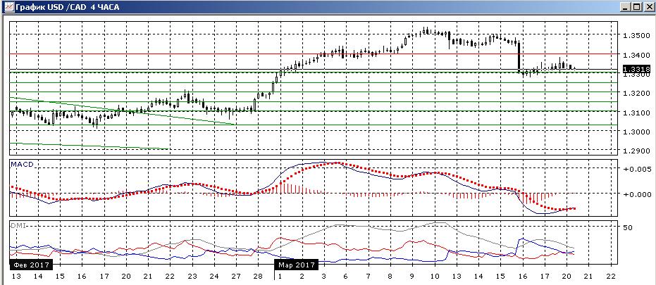 На четырёхчасовом графике также видно завершение коррекционного роста пары, который остановился ниже 1,3400. Пара приближается к уровню 1,3300, который является сейчас ближайшей целью. При его преодолении, следующей целью будет уровень 1,3250 — он ранее проявлялся как уровень поддержки/сопротивления, а кроме того в последнее время пара склонна двигаться на «круглые» величины — кратно 50 и 100 пунктов.