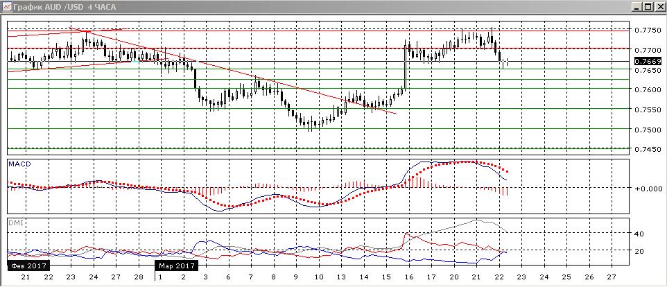 На дневном графике пара достигла целевого уровня — относительного максимума февраля, и снизилась, вернувшись ниже уровня сопротивления на 0,7700. Значение уровня 0,7745 как сопротивления подтвердилось — ранее, кроме февраля, вершины в этой зоне образовывались в августе-октябре 2016 г. Против прорыва уровня 0,7745 также образование сейчас медвежьего расхождения максимумов пары и гистограммы MACD. Вместе с тем, влияние резкого прорыва вверх после заседания FOMC нельзя исключать — пара пока остаётся в пределах свечи 15 марта, и остаётся выше зоны сильной поддержки на 0,76-0,75. Пока откат от 0,7600 небольшой и не является длительным, подозревать образование большой двойной вершины в феврале-марте на 0,7745 рано.