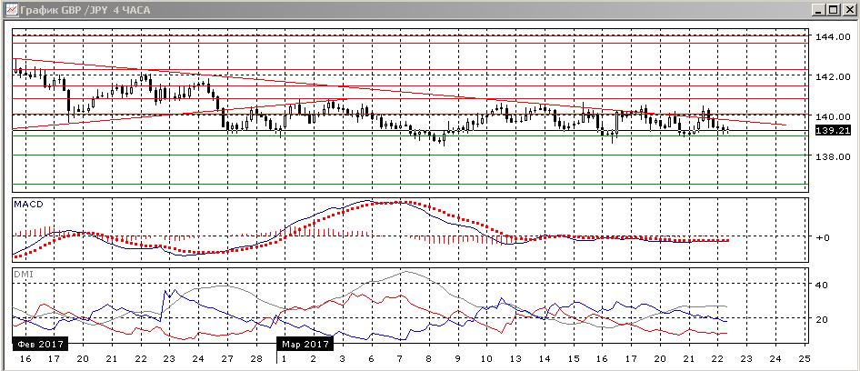 На четырёхчасовом графике пара остаётся в канале 139,000-140,80. Предыдущая волна роста в канале почти достигла уровня предыдущих максимумов около 140,50 далее при снижении пара достигла уровня поддержки 139,00 и выше этого уровня снижение прекратилось. В рамках движения в канале более вероятным видится рост пары до предыдущих максимумов около 140,50, но постепенно снижающаяся линия долгосрочного тренда является дополнительным фактором давления. По гистограмме и линии MACD в этом масштабе флэт.