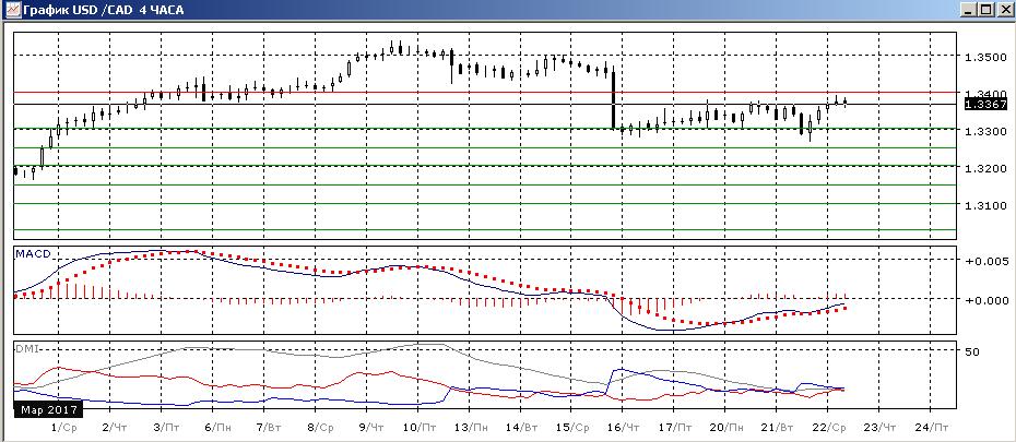 На четырёхчасовом графике пара стабилизировалась, можно рассматривать консолидацию в границах 1,3300-1,3400, пара возвратилась сейчас к предыдущим максимумам 17 и 20 марта. Так как коррекционное движение от 1,3300 вверх не привело к развитию роста, скорее оно будет завершаться с новым тестированием уровня 1,3300. По индикаторам направленного движения в этом масштабе флэт. Более долгосрочно, продолжение снижения от 1,3538 видится предпочтительным, так как текущая консолидация, скорее, является «фигурой продолжения» тенденции.