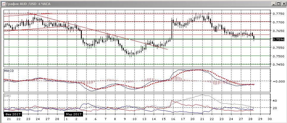 На четырёхчасовом графике после колебаний кооло 0,7625 пара снизилась ниже уровня поддержки 0,7600. Закрепление ниже открывает дорогу к 0,7500, следующая ближайшая поддержка на 0,7550. По индикаторам направленного движения снижение немного более предпочтительно: DM- выше DM+, гистограмма MACD и линия MACD соответствуют флэту (это характеризует ситуацию до пробоя 0,7600). Образовалось бычье расхождение минимумов пары и гистограммы MACD, поэтому при расчёте на снижение надо дождаться закрепления ниже 0,7600, чтобы то не было ложным пробоем уровня.