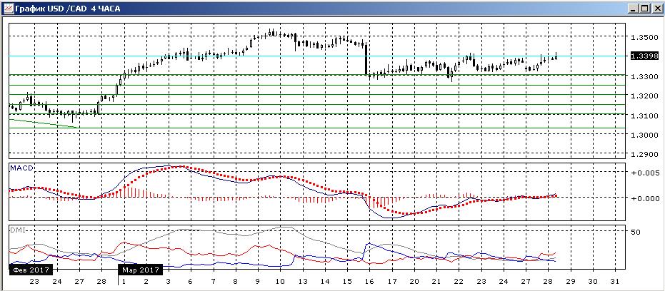 На четырёхчасовом графике пара остаётся в диапазоне 1,3300-1,3400, на данный момент она тестирует уровень 1,3400, но преодоления его не было. В рамках движения в диапазоне предпочтительно снижение к нижней границе 1,3300. По индикаторам направленного движения флэт — DM+ и DM- близки, гистограмма MACD колеблется около нуля, линия MACD почти горизонтальна.