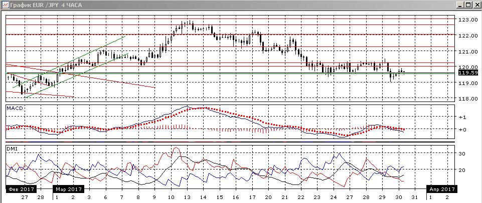 На четырёхчасовом графике ситуация двойственная. С одной стороны, пара после пробоя нижней границы канала 119,50-120,25 вновь вернулась в него, что может делать выход вниз ложным пробоем. С другой стороны, пара развернулась вниз около середины диапазона и достигла нижней границы канала, что не похоже на возобновление движения в канале. Определяющим сейчас будет то, удержится ли пара выше 119,50, или нет. Если пара остаётся в канале, ближайшей целью видится движение до верхней границы 120,25. Если пара закрепляется ниже 119,50, это открывает дорогу к возобновлению снижения с первой целью 119,00 (предыдущем минимуме) и далее к 118,20, так как сильных уровне поддержки до этого уровня нет.