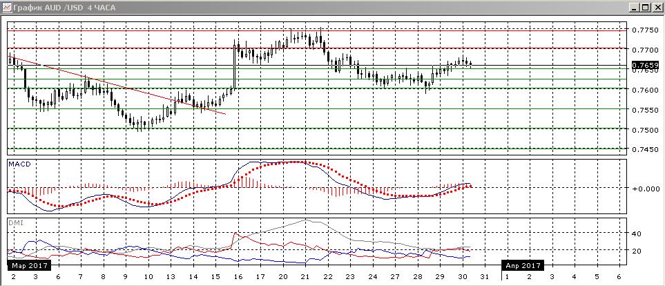 На четырёхчасовом графике произошёл разворот: последовательность снижения относительных минимумов и относительных максимумов нарушена, пара достигает более высоких максимумов и преодолела уровень сопротивления 0,7650. Сейчас уровень 0,7650 можно рассматривать как ближайший уровень поддержки для пары. По индикаторам направленного движения пара перешла к росту: DM+ сейчас выше DM-, гистограмма MACD остаётся в положительной области, линия MACD имеет положительный наклон. Пока продолжение роста в краткосрочной перспективе видится предпочтительным.