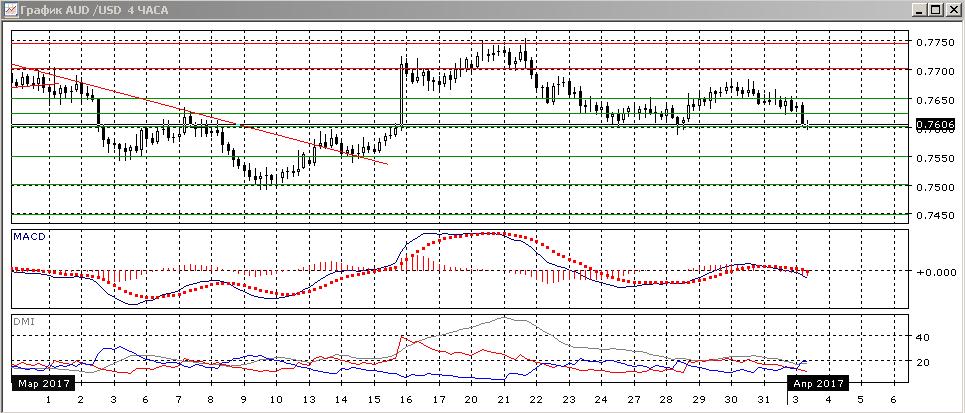 На четырёхчасовом графике также ключевым для дальнейшего движения видится устойчивость уровня 0,7600. Если пара преодолеет этот уровень, то снижение не будет иметь сильных препятствий до 0,7550 (поддержка 3 и 14 марта). В этом масштабе относительные максимумы и минимумы пары снижаются от 0,7680. По индикаторам направленного движения пара вновь снижается: DM- выше DM+, гистограмма MACD снижается в отрицательной зоне, линия MACD увеличивает отрицательный наклон.