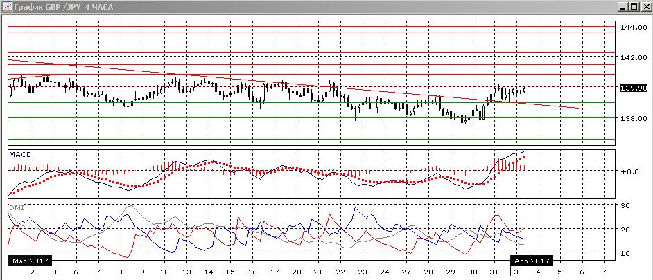 На четырёхчасовом графике пара также преодолела линию тренда вместе с преодолением уровня сопротивления 139,00. После преодоления этого уровня он выступил уже поддержкой, далее пара вернулась к 140,00. Консолидация пары выше линии нисходящего тренда скорее предполагает продолжение роста.
