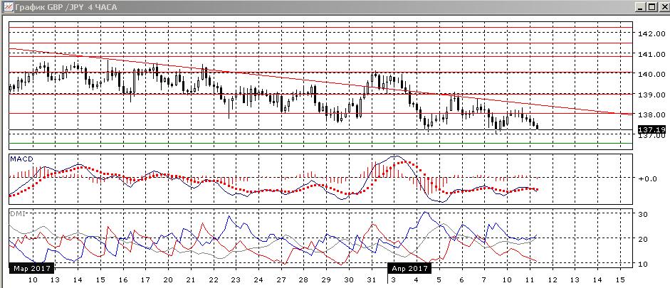 На четырёхчасовом графике пара снижается от 138,00. Целью снижения видится уровень 137,00, около относительных минимумов 4 и 7 апреля. В целом последовательное снижение сохраняется и разворота тенденции пока не видно, что делает более вероятным её продолжение.