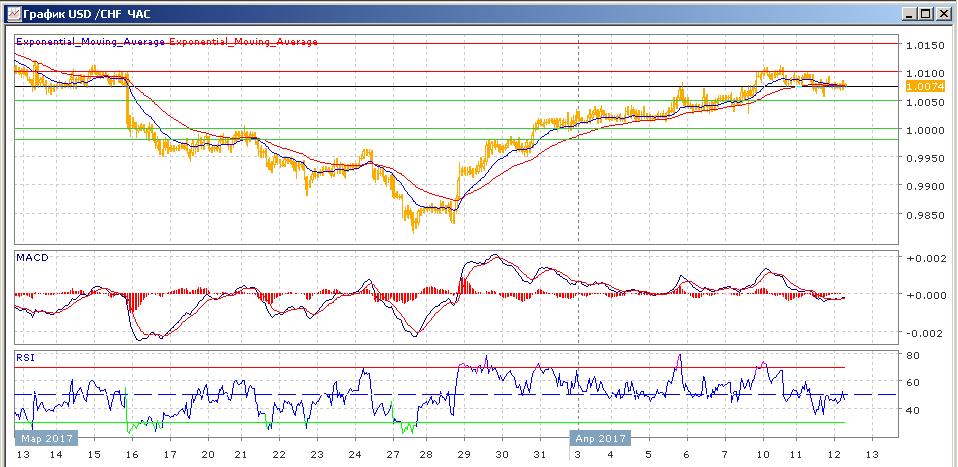 Пара продолжает начатый 28 марта рост. В понедельник пара закрылась с небольшим снижением, несколько раз протестировав сопротивление на 1.0100 и показав почти месячный максимум. Вчера снижение было также небольшим. Сегодняшние торги проходят на уровне открытия в районе 1.0076. Средние скользящие ЕМА21 и ЕМА55 направлены вверх и растут, но начали замедляться. Индикаторы MACD и RSI вчера ушли ниже своих центральных линий и сегодня склонны к снижению.