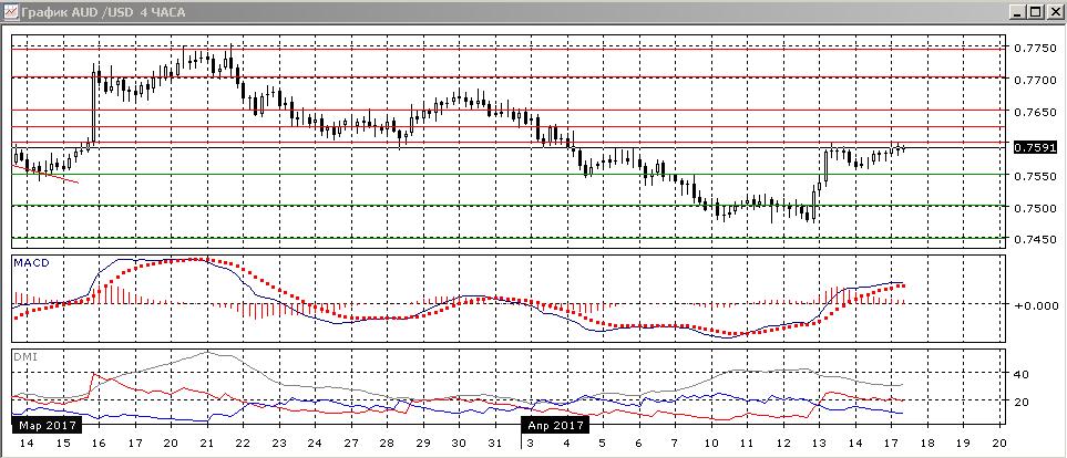 На четырёхчасовом графике пара вернулась к начальной точке отката вниз на 0,7600. Завершение коррекции может предполагать продолжение роста выше 0,7600. При закреплении выше этого уровня следующее сопротивление может быть на 0,7650 (около максимумов в конце марта). Укрепляет сопротивление на 0,7600 образование медвежьего расхождения максимумов пары и гистограммы MACD, и возможно образование на 0,7600 двойной вершины. По индикаторам направленного движения тенденция роста сохраняется: DM+ выше DM- при высоком уровне ADX, гистограмма MACD, хотя и снижается, остаётся в положительной зоне, линия MACD сохраняет положительный наклон. Дальнейшая перспектива, вероятно, определится тем, сможет ли пара преодолеть уровень 0,7600.