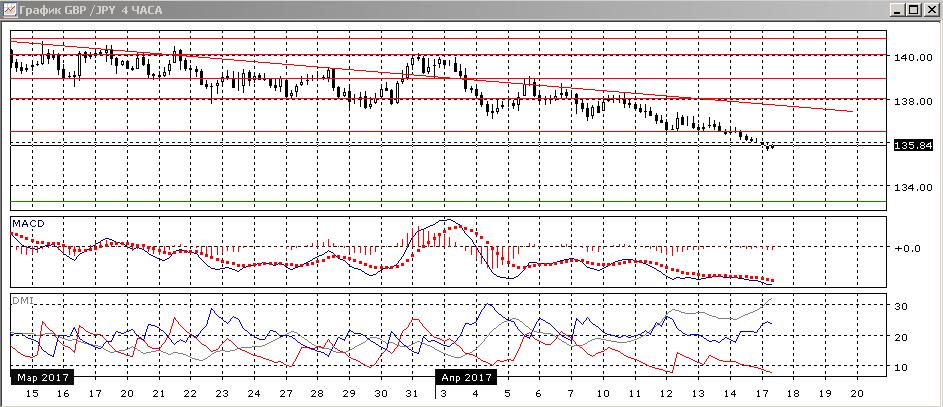 На дневном графике было закрытие ниже уровня 136,50 (около относительного минимума января, он же минимум года). Закрепление ниже этого уровня открывает пространство для дальнейшего снижения, так как обоснованных уровней поддержки вблизи нет, ближайшим видится 133,25 (на относительном минимуме, достигнутом после референдума в Великобритании в прошлом году). Пара остаётся ниже линии нисходящего тренда, последовательность снижения относительных максимумов и минимумов пары сохраняется. По индикаторам направленного движения тенденцией является снижение: превышение DM- над DM+ большое, ADX на высоком уровне, гистограмма MACD снижается в отрицательной зоне, линия MACD имеет отрицательный наклон.