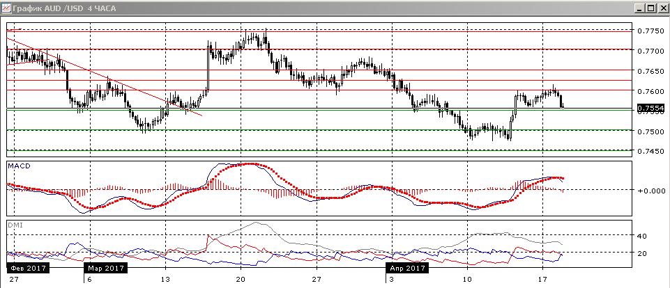 На четырёхчасовом графике пара находится у предыдущего относительного минимума выше 0,7550. Преодоление его открыло бы дорогу к снижению до 0,7500 и, возможно, до 0,7475 (базы, с которой начался отскок вверх). На 0,7600 образовалась двойная вершина, причём вторая вершина — с «падающей звездой». Снижение пары ниже 0,7550 показало бы, что преодолён промежуточный минимум двойной вершины.