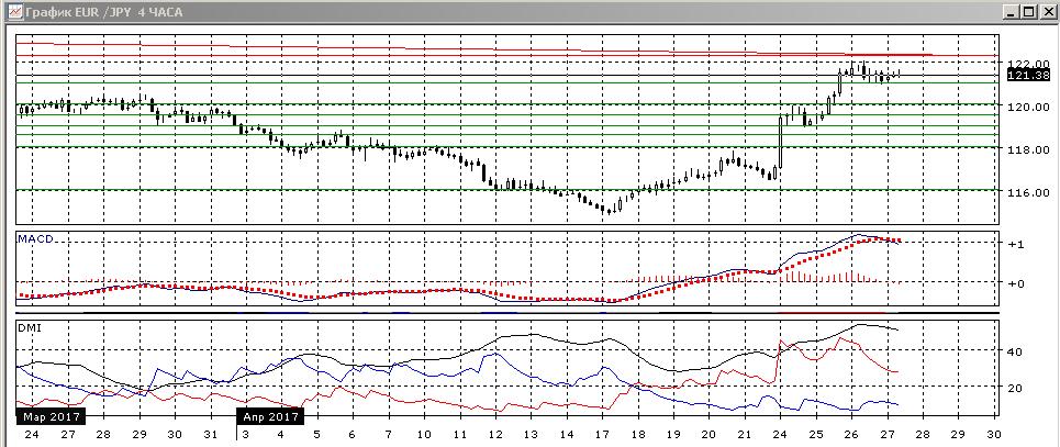 На четырёхчасовом графике небольшой откат от 120,00. Пока снижение остаётся, скорее, консолидацией на достигнутом уровне — уровень пары мало снизился от 122, пара стабилизировалась около 121,30. По индикаторам направленного движения — коррекция к росту: гистограмма MACD снижается, линия MACD развернулась, но по ADX роста остаётся сильно выраженным. Последовательность роста относительных максимумов и минимумов пары от 115 не нарушена. Исходя из взгляда на текущее снижение как на коррекцию, скорее рост возобновится с новым тестированием уровня 122,00.