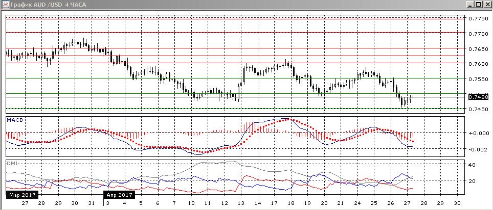 На дневном графике в среду пара закрылась ниже важного уровня поддержки 0,7500, что говорит о вероятном прорыве уровня и перспективе дальнейшего снижения. Закрытие было ниже минимума марта и около предыдущих минимумов апреля. Если смотреть шире, то снижение от 0,7745 с 20 марта продолжается — относительные максимумы последовательно снижаются. В среду пара получила поддержку при приближении к уровню поддержки 0,7450, но пока остаётся ниже нижней границы предыдущего диапазона 0,7500. Выход из диапазона вниз делает предпочтительным дальнейшее снижение, целью может быть зона 0,7250 (движение, равное ширине диапазона в 250 пунктов). По ADX пара выходит из нейтрального состояния: превышение DM- над DM+ увеличивается.