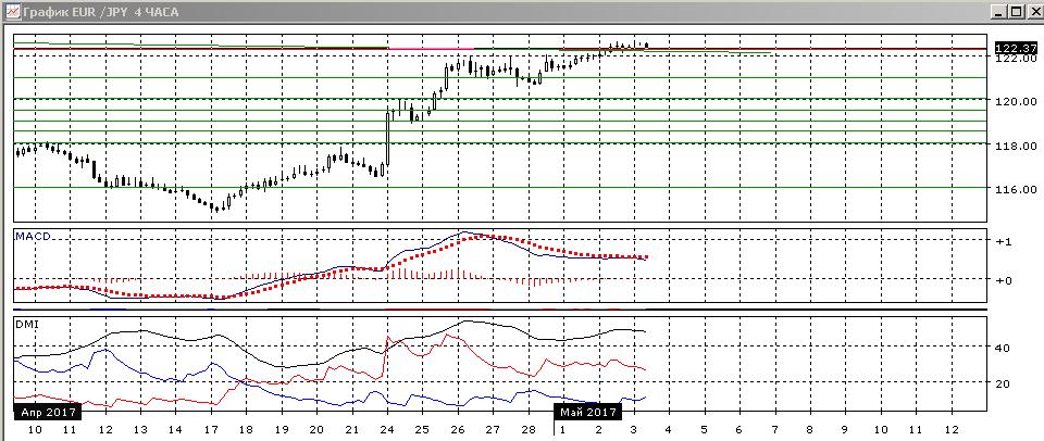На четырёхчасовом графике пара переместилась выше 122,00, и сейчас находится в узком диапазоне выше 122,25. Образование свечей «дожи» говорит о выжидательной позиции. Завершение заседания ФРС может подтолкнуть пару в каком-то направлении. Консолидация выше предыдущего уровня сопротивления на 122,00 (максимумы 26-28 апреля) скорее в пользу дальнейшего движения вверх. Сохраняется медвежье расхождение максимумов пары и гистограммы MACD, что увеличивает вероятность снижения, но ранее это не помешало паре преодолеть сопротивление на 122,00. Сейчас более вероятно, что рост продолжится, пока пара находится выше 122,00. По ADX тенденция роста остаётся сильной: превышение DM+ над DM- значительное и устойчивое при высоком уровне ADX.