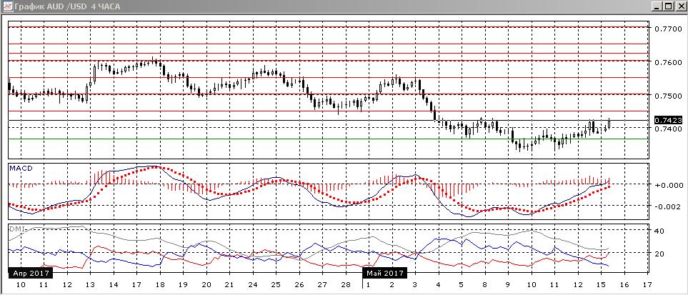 На четырёхчасовом графике разворот уже произошёл. Пара преодолела уровень 0,7400, кроме того, что это психологически важный уровень, около него была промежуточная вершина для двойного дна около 0,7330. Преодоление этого уровня означает подтверждение модели двойного дна. Относительные максимумы и минимумы пары сейчас растут. Пара приблизилась к максимумам 5, 8 мая, и предыдущему максимуму 12 мая. Преодоление уровня 0,7430 открыло бы дорогу к росту в краткосрочной перспективе. По индикаторам направленного движения тенденцией стал рост: DM+ выше DM-, гистограмма MACD остаётся в положительной зоне, линия MACD сохраняет положительный наклон.