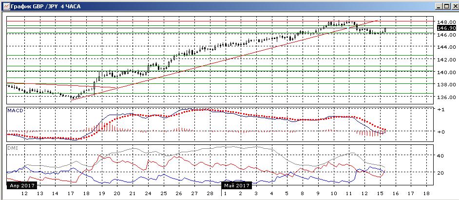 На четырёхчасовом графике пара стабилизировалась около 146,00 и в начале понедельника растёт от этого уровня. Сейчас она находится около предыдущего относительного максимума, его преодоление открывает дорогу к росту до 148,00, но этот уровень будет для пары сильным сопротивлением, учитывая максимумы 9-11 мая.