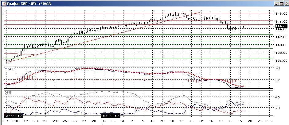 На дневном графике несмотря на текущий небольшой осткок, в целом ситуация не изменилась: пара остаётся ниже линии восходящего тренда с 17 апреля, относительные максимумы и минимумы снижаются. Текущий отскок слабый, он остался ниже уровня 145,00. Большая часть роста в течение четверга не была удержана. Сейчас отскок продолжается, но он, скорее, будет только коррекцией к снижению в вершина на 148,00 видится более значимой в дальнейшей перспективе. Ио индикаторам направленного движения пара может перейти к снижению: DM- и DM+ eже близки, гистограма MACD снижается в отрицательной зоне при развороте линии MACD вниз. Ниже сильная подденжка видится на 142,50.