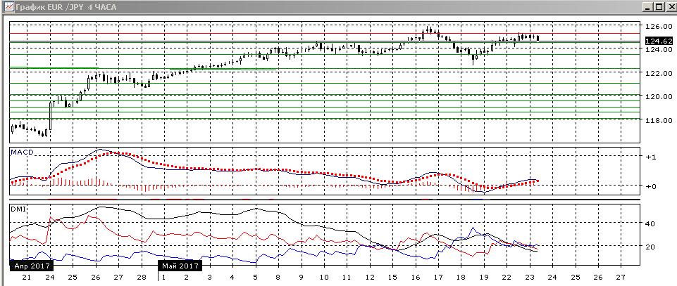 На четырёхчасовом графике отскок замедляется, пара консолидируется выше 124,50, который можно рассматривать как уровень поддержки после его преодоления. Более вероятно, что после консолидации выше 124,50 пара продолжит рост до уровне предыдущей вершины, но если она вернётся ниже 124,50, это изменило бы картину. По индикаторам направленного движения флэт: DM+ и DM- близки, гистограмма MACD колеблется около нуля.