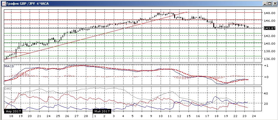 На четырёхчасовом графике пара снижается после тестирования уровня 145,00, они достигла уровня 144,00 , и скорее снижение будет продолжаться, так как коррекция вверх заканчивается при более длительной тенденции снижения пары с 10 мая. По индикаторам направленного движения тенденцией остаётся снижение: DM- выше DM+, замедление снижения при коррекции видно по нахождению гистограммы MACD около нуля и примерно горизонтальной линии MACD. Ближайшая цель снижения видна по более крупному масштабу: 142,50.