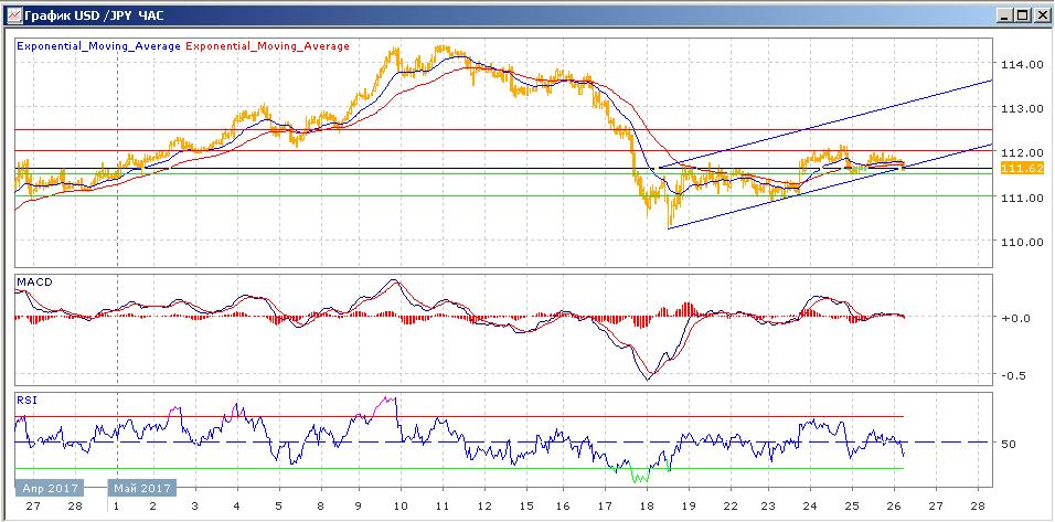 с прошлого четверга пара пытается расти. Среду и четверг пара провела в диапазоне 111.50-112.00. в среду пара закрылась с небольшим снижением на 111.50, протестировав к концу торгов сопротивление на 112.00. вчера пара закрылась со слабым ростом. Сегодняшняя сессия проходит с небольшим снижением пары, которая пытается преодолеть поддержку в виде нижней границы восходящего канала. Средние скользящие ЕМА21 и ЕМА55 направлены вверх и слабо растут. Индикаторы MACD и RSI находятся ниже своих центральных линий и сегодня склонны к снижению. Цели вверх: 112.00, 112.50. Цели вниз: 111.50, 111.00.