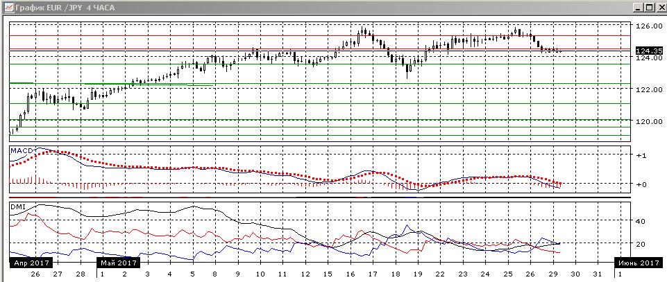 На четырёхчасовом графике пара консолидируется ниже уровня 124,50 (раньше он был сопротивлением 9-11 мая, и поддержкой 19-23 мая). Пара ниже предыдущих минимумов. Консолидация ниже уровня поддержки предполагает, что снижение скорее возобновится. По индикаторам направленного движения тенденцией стало снижение: DM- выше DM+, гистограмма MACD в отрицательной области, линия MACD имеет отрицательный наклон. Ближайшая сильная поддержка на 123,50.