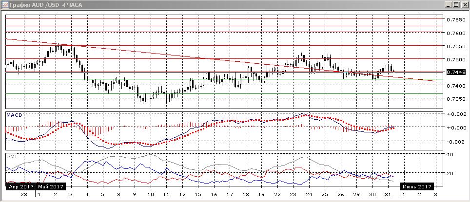 На четырёхчасовом графике ситуация скорее нейтральная. После консолидации ниже 0,7450 пара вновь преодолела этот уровень, но рост не был развит, и пара продолжает оставаться около него. По индикаторам направленного движения флэт. В целом можно говорить о колебаниях около 0,78450 с середины мая. Сейчас рост немного более предпочтителен с ограниченной целью (0,7500), так как пара преодолела уровень сопротивления на 0,7450 и остаётся выше него.