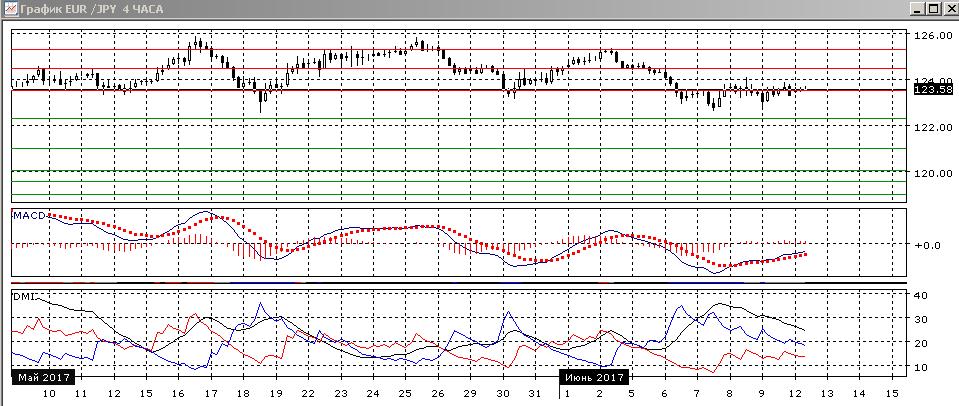 На дневном графике пара остаётся около нижней границы консолидации 123,50-125,30. Пара колеблется около этого уровня. Преодоление уровня несмотря на два закрытия ниже не произошло, но и восстановления с возвращением в консолидацию также не было. 7 июня пара достигла более низкого минимума. Снижение относительных максимумов и минимумов с 25 мая продолжается. По индикаторам направленного движения тенденцией остаётся снижение: гистограмма MACD остаётся в отрицательной области, линия MACD имеет отрицательный наклон, DM- выше DM+.