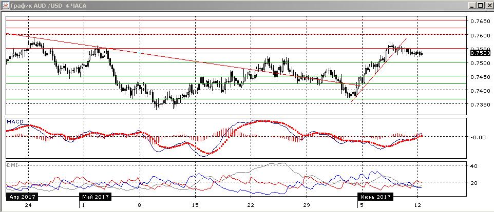 На четырёхчасовом графике пара снижается и после возвращения ниже 0,7550 консолидируется ниже этого уровня, снижение остановилось. Темп снижения является намного более медленным, чем предыдущий рост, и сам размер коррекции пока небольшой Пара преодолела краткосрочную линию тренда, если строить её со 2 июня, но это не привело к развороту. По индикаторам направленного движения рост остаётся тенденцией: гистограмма MACD в положительной зоне, линия MACD сохраняет положительный наклон, DM+ выше DM-. Пока пара выше 0,7500, продолжение роста видится предпочтительным.