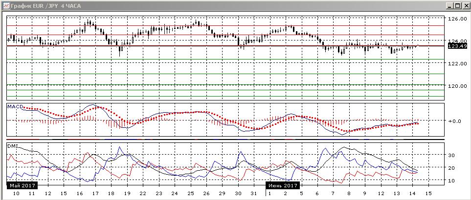 На дневном графике ситуация мало изменилась: пара остаётся около нижней границы консолидации 123,50-125,30. Закрытия ниже нижней границе диапазона делают более вероятным дальнейшее снижение. Исходя из размера диапазона, целью движения вниз видится поддержка на 121,00. По индикаторам направленного движения тенденция сохраняется: гистограмма MACD остаётся в отрицательной области, линия MACD имеет отрицательный наклон, DM- выше DM+.