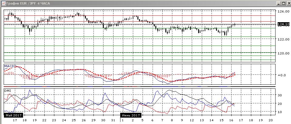 На четырёхчасовом графике произошёл переход к росту: пара преодолела серию предыдущих относительных максимумов, по индикаторам направленного движения пара перешла к росту. Пока пара выше 123,50, более вероятно продолжение роста, при возвращении ниже преодоления уровня 123,50 превращается в «ложный пробой», и становится предпочтительным снижение вновь к 122,30.