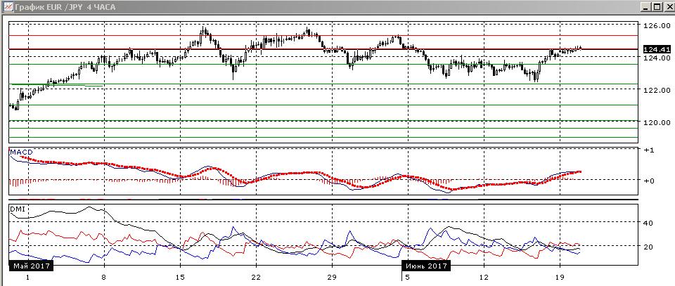На дневном графике пара преодолела уровень 123,50. Закрепление выше предполагает, что скорее рост будет продолжаться. Пара находится в диапазоне с середины мая, между 123,50 и 125,30. Исходя из этого, предпочтительным видится достижение верхней границы 125,30. По индикаторам направленного движения явной тенденции нет, краткосрочно предпочтителен рост (гистограмма MACD растёт и приближается к положительной зоне, линия MACD разворачивается).