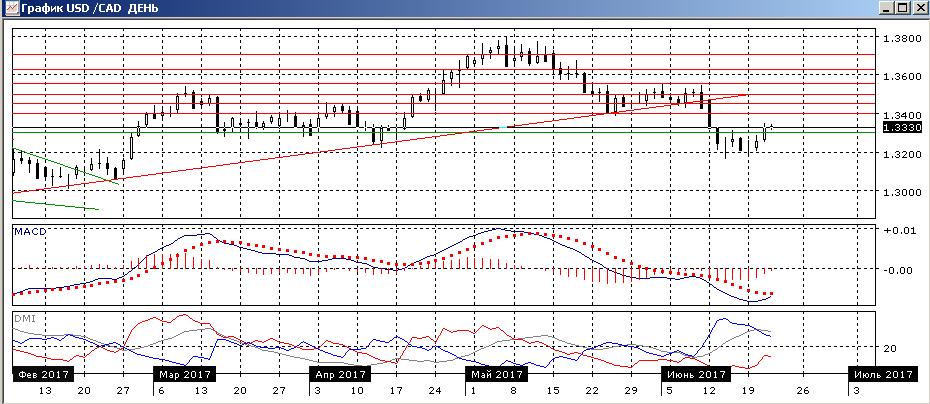 На дневном графике после тестирования уровня поддержки 1,3200 выросла, и закрытие было выше 1,3300, что предполагает продолжение отскока. Сейчас рост остаётся в пределах коррекции к снижению пары. По ADX тенденция снижения сильная, превышение DM- над DM+ большое. Более сильное сопротивление можно ожидать на 1,3400, при преодолении этого уровня открывалась бы дорога к 1,3550.
