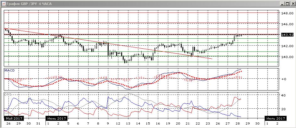 На дневном графике пара преодолела предыдущий относительный максимум около 142,50. Это привело к тому, что последовательность относительных максимумов и минимумов пары теперь растёт. По индикаторам направленного движения пара переходит к росту: DM+ выше DM-, гистограмма MACD растёт в положительной зоне, линия MACD получила положительный наклон. Ближайшей целью движения видится сопротивление на 145,00. Учитывая, что во вторник образовалась широкодиапазонная свеча, скорее рост будет продолжаться в ближайшей перспективе.