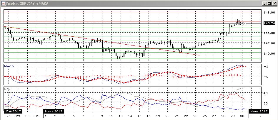 На четырёхчасовом графике пара тестировала уровень 146,15, сейчас происходит консолидация ниже. Последовательность роста относительных максимумов и минимумов пары не нарушена. По ADX тенденция роста очень сильная: превышение DM+ над DM- очень большое, ADX на высоком уровне. Вместе в тем, размер волны оста от 140 уже достаточно большой для того, чтобы проходить без существенных откатов. Дальнейшую ближайшую перспективу определит, вероятно, будет ли преодолён уровень 146,15 — если пара закрепится выше, то стоит ожидать движения до 148,00, при откате сильная поддержка должна быть на 144,00.
