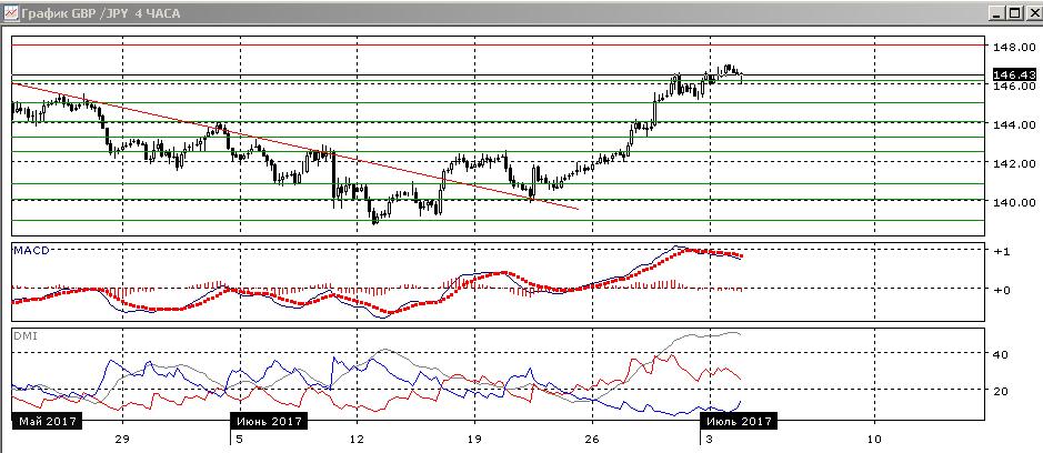 На дневном графике были закрытия выше уровня сопротивления на 146,15. Учитывая, что пара большую часть движения от 148,00 вниз до 139,00 уже отыграла, скорее уровень 148,00 будет достигнут. По ADX рост остаётся хорошо выраженной тенденцией - DM+ значительно выше DM- при высоком уровне ADX. Гистограмма MACD растёт в положительной зоне, линия MACD имеет положительный наклон. Уровень 146,15 выступает сейчас поддержкой для пары после того, как он был преодолён. Движение до 148,00 вероятно продолжится.