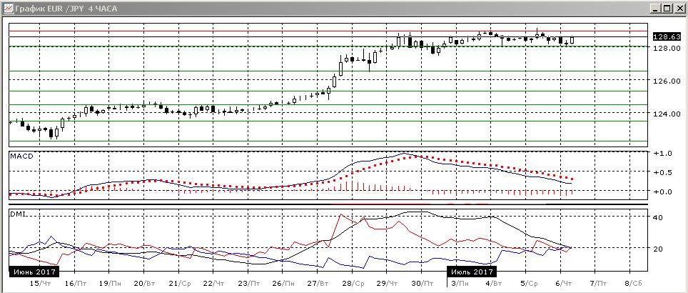 На четырёхчасовом графике картина больше складывается в строну разворота. Около 129,00 может образоваться тройная вершина. Исходя из движения в канале 128-129, сейчас более вероятно движение к верхней границе. Более значительное движение, вероятно, будет в сторону выхода пары из канала. По индикаторам направленного движения в этом масштабе тенденцией становится снижение: гистограмма MACD в отрицательной области, линия MACD направлена вниз, DM- выше DM+. При преодолении уровня поддержки на 128,00 целью видится уровень 126,50 (поддержка 28 июня)