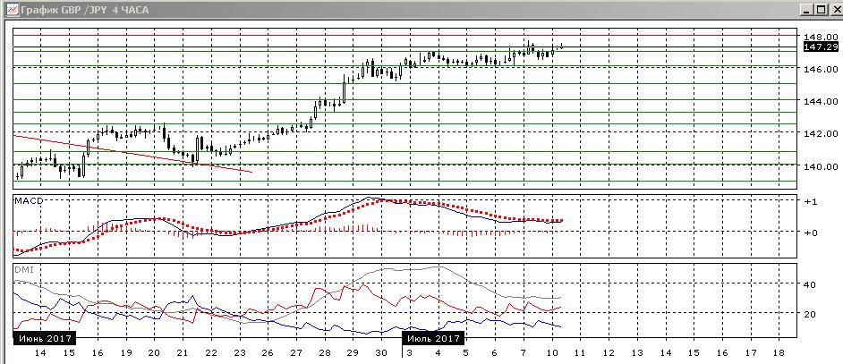 На четырёхчасовом графике рост ослабляется (он не подтверждается по гистограмме MACD (около нуля) и линии MACD (почти горизонтальна), однако по ADX тенденция остаётся хорошо выраженной — превышение DM+ над DM- большое и устойчивое. Пара вернулась выше верхней границы канала 147,00. Исходя из этого, скорее рост будет продолжаться с целью на 148,00, ближайшего сильного сопротивления. Уровень верхней границы канала 147,00 может быть уже поддержкой.