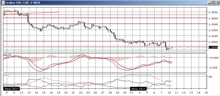 На дневном графике небольшая консолидация ниже 1,3000 завершилась очередным днём существенного снижения в пятницу. Так как пара остаётся ниже важного уровня 1,3000, то скорее снижение будет продолжаться, тем более если рынок получит подтверждения ожиданий разворота денежной политики Банка Канады. Пара снижается несмотря на снижение цены на нефть — обычно важного фактора для канадского доллара. Это показывает силу его поддержки на данный момент. По ADX тенденция снижения является очень сильной: DM- существенно выше DM+, превышение устойчивое при росте ADX.