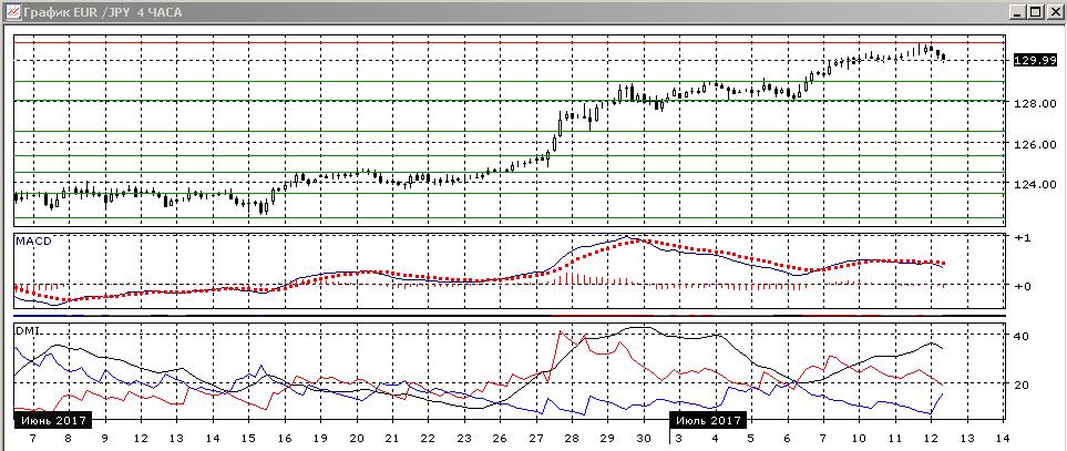 На четырёхчасовом пара вернулась к ранее преодолённому уровню 130,00. Здесь можно ожидать поддержки, но в случае преодоления уровня скорее снижение продолжится до уровня, ограничивавшего рост пары 29 июня — 5 июля. По индикаторам направленного движения — коррекция к росту: по ADX тенденция роста сохраняется, превышение DM+ над DM- устойчивое, коррекция видна по снижению гистограммы MACD уже в отрицательной области и развороту линии MACD. В случае, если пара преодолеет поддержку на 130, это обозначало бы и преодоление уровня предыдущего минимума