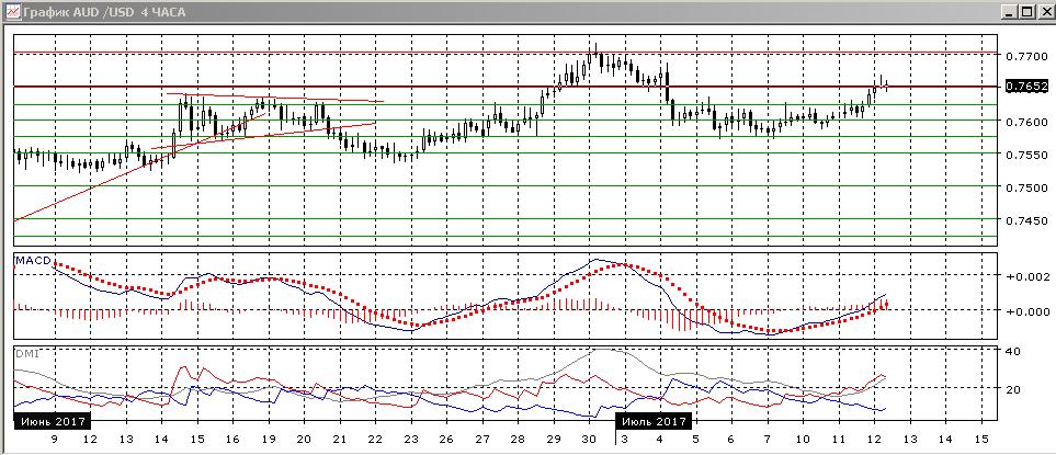 На дневном графике пара после остановки около 0,7600 вышла от этого уровня вверх, преодолев сопротивление на 0,7625. В целом тенденция роста пары с мая сохраняется (последовательность роста относительных максимумов и минимумов пары не нарушена). По индикаторам направленного движения — коррекция к росту — по ADX прtвышение DM+ над DM- сохраняется, но гистограмма MACD уже в отрицательной области, линия MACD получила отрицательный наклон. Образование несмотря на сохранение тенденции, она кажется выдыхающейся, скорее снижение возобновится и ближайшей целью видится возвращение к началу отскока на 0,7575.