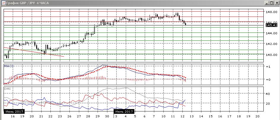 На четырёхчасовом графике разворот уже произошёл: пара преодолела уровень предшествующих минимумов, преодолела важный в данном масштабе уровень поддержки на 146,15. По индикаторам направленного движения тенденцией стало снижение: DM- сейчас выше DM+, гистограмма MACD снижается в отрицательной зоне, линия MACD имеет отрицательный наклон. Следующей целью видится уровень 144,00 (сопротивление 27-28 июня).