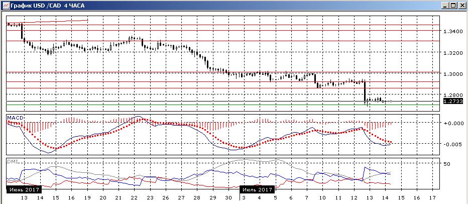 На дневном графике пара продолжила снижение после решения Банка Канады в среду, при этом был энергично преодолён уровень 1,2860, на предыдущем относительном минимуме. Сразу сразу преодолела и следующий «круглый» уровень 1,28. Отскока вверх после резкого снижения пока не было, скорее это говорит о силе тенденции снижения. Изменение политики Банка Канады — долгосрочный фактор, и вероятно сильный импульс 12 июля (образовалась широкодиапазонная свеча) будет сохраняться. Несмотря на то, что образовалось бычье расхождение минимумов пары и гистограммы MACD, что увеличивает вероятность отскока, и в целом перепроданность пары (существенных коррекций снижения от 1,3550 не было), против столь сильной тенденции снижения идти опасно.