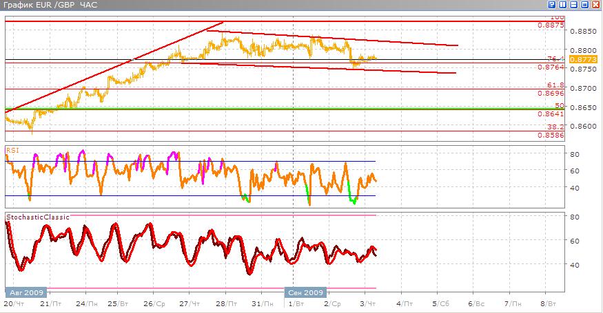 Валюта закончила предыдущее восходящее движение и сменила свой тренд на противоположные ему - «медвежий». Сейчас движение можно сказать, что боковое, на это нам указывает канал в которой она находится, возможен в ближайшее время пробой канала на уровне 76,4% по Фибоначчи.