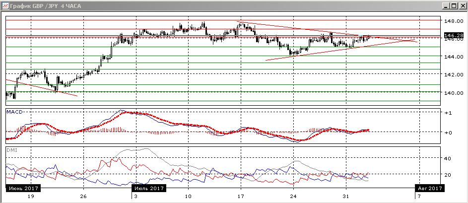 На четырёхчасовом графике скорее период неопределённости, учитывая, что по индикаторам направленного движения тенденции нет и в этом масштабе. Если представлять движение с 17 июля как движение в треугольнике, то пара достигла его верхней границы, и при выходе выше 146,00 пара вышла бы из треугольника вверх, что сделало бы более вероятным продолжение роста.