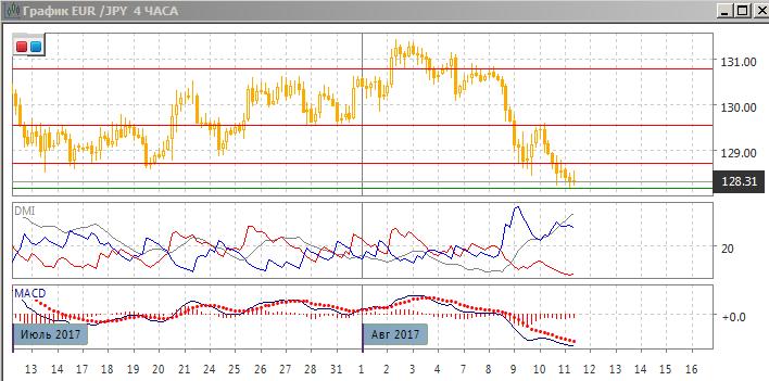 Пара остаётся ниже восходящего тренда с апреля, образование свечи «молот» в не привело к отскоку, и пара достигла нового минимума. Закрепление пары ниже тренда и ниже уровня поддержки на 128,70 (около минимумов июля) предполагает, что скорее пара будет продолжать снижаться также, так как у 130,80 формируется большая вершина. В перспективе сильная поддержка видится только на 125,00. По индикаторам направленного движения тенденцией является снижение: DM- выше DM+, гистограмма MACD снижается в отрицательной области, линия MACD имеет отрицательный наклон.