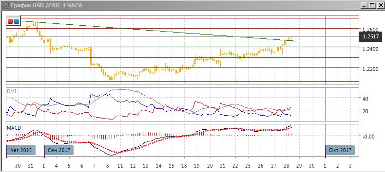 На дневном графике пара перешла к росту: был преодолён важный уровень сопротивления на минимуме июля и около минимума конца августа. По индикаторам направленного движения тенденцией стал рост: DM+ выше DM-, гистограмма MACD растёт в положительной зоне, линия MACD сохраняет положительный наклон. Пара преодолевает линию нисходящего тренда, построенную по максимумам августа (она находится сейчас на 1,2470), что также убирает одну из технических препятствий для роста. «Круглый» уровень на 1,2500 уже достигнут, следующей целью может быть уровень 1,2600, если исходит их того, что пара ранее двигалась между круглыми уровнями.