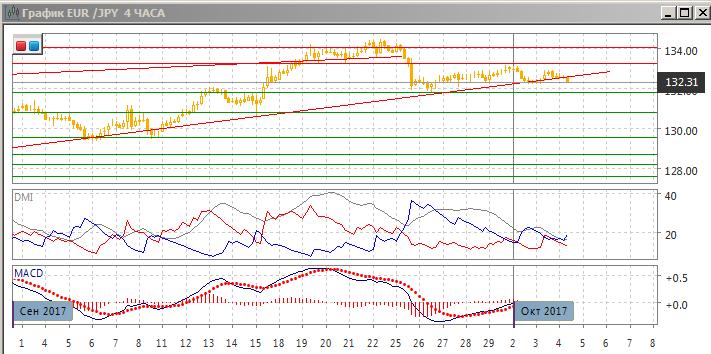 На четырёхчасовом графике пара находится около линии тренда по минимумам сентября. Последний относительный максимум пары также ниже предыдущего. Кажется предпочтительным завершение коррекции вверх с возвратом к 131,80. По индикаторам направленного движения явной тенденции нет: DM- и DM+ близки, ADX снизился.