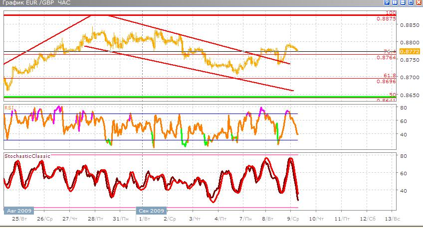 Валюта пробила свой нисходящий канал, и находится в боковом движении возле уровня 76,4% по Фибоначчи. Скорее всего боковое движение будет не продолжительным и падение может вновь возобновиться. Сейчас очень трудно судить наверняка куда будет дальнейшее движение, так как основные индикаторы находятся в середине их коридоров- это 60 и 40, и новых сигналов к покупке не демонстрируют, а предыдущий сигнал к продаже начинает иссякать. Обращая также особое внимание на валюты которые являются основными в данном кросс-курсе это euro и gbp, они сейчас двигаются в направлении продажи.