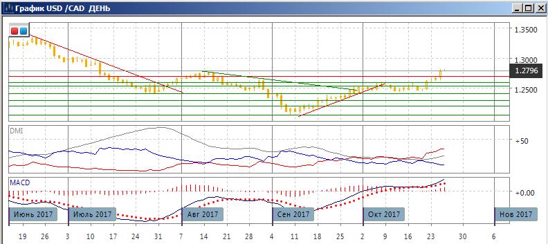 На дневном графике рост пары продолжился. Теперь она преодолела два относительных максимума октября у 1,2600 и находится выше максимумов августа. Изменение позиции Банка Канады стало сильным новостным фактором, который небыл отыгран после первоначальной реакции. Скорее, движение в этом направлении будет продолжаться, хотя образовалось медвежье расхождение максимумов пары и гистограммы MACD. По ADX тенденция роста усиливается: превышение DM+ над DM- увеличивается при росте ADX. Так как вблизи сильного сопротивления до 1,30 не видно, этот уровень видится целью при текущем прорыве вверх.